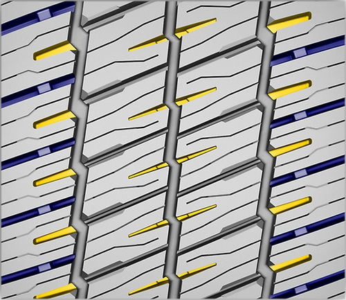В рисунке протектора модели Vanis AllSeason преобладают глубокие и широкие канавки. Они не только эффективно предотвращают аквапланирование на мокром асфальте, но и улучшают управляемость и длину тормозного пути на снегу за счёт того, что могут вместить в себя большее количество снега.