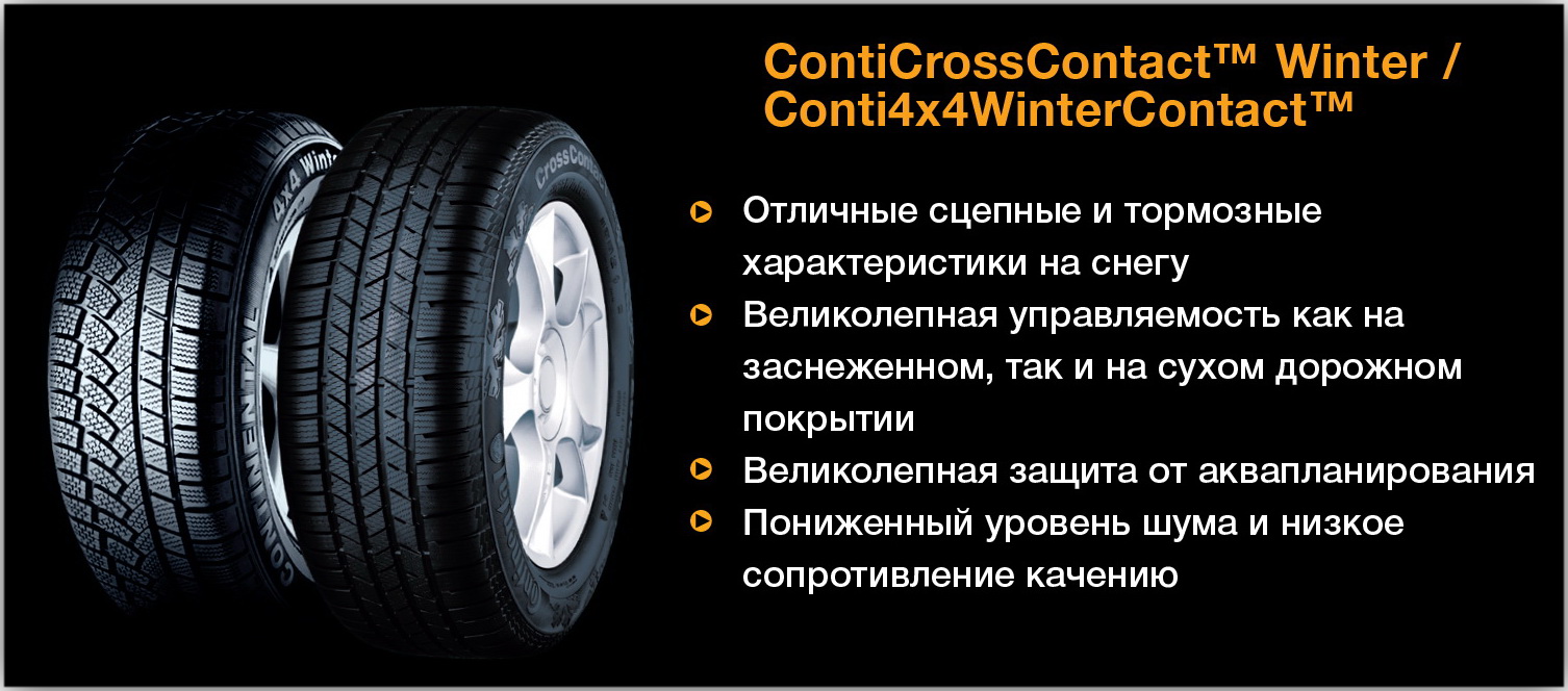 CONTINENTAL 4x4WinterContact — универсальная зимняя шина для внедорожников. Отличная управляемость и торможение на зимней дороге, превосходные эксплуатационные характеристики на снегу и льду. Шина имеет асимметричный рисунок протектора для лучшего сцепления как с сухой, так и с заснеженной дорожной поверхностью. Широкие продольные канавки быстро и эффективно отводят воду и снежную кашу из пятна контакта, предотвращая аквапланирование. Модель демонстрирует отличное сцепление с поверхностью дороги даже на сильно заснеженных участках. Резиновая смесь с добавлением кремния улучшает тягово-сцепные характеристики зимней шины CONTINENTAL 4x4WinterContact на сухом и мокром покрытии.