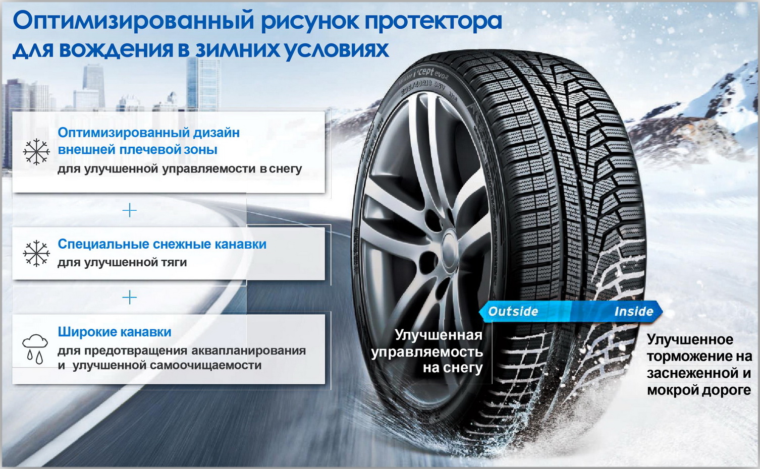 Более широкие блоки плечевой зоны (по сравнению с обычными зимними шинами Hankook) обеспечивают оптимальные характеристики управляемости и улучшают сцепление.