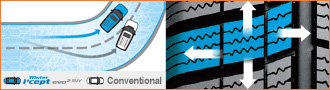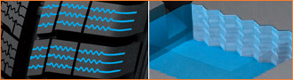 — несколько видов трехмерных ламелей улучшают множество технических характеристик помимо сцепления на скользких дорогах, начиная от курсовой устойчивости и заканчивая стойкостью протектора к неравномерному износу;