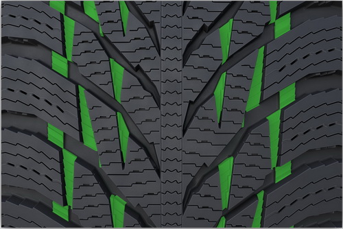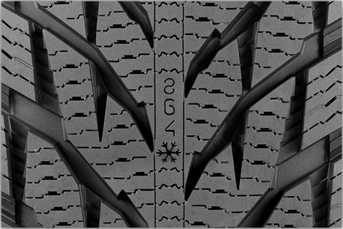 Агрессивный рисунок протектора покрыт еще более плотной сеткой ламелей и V-образными разрезами по обе стороны центрального ребра. Дополнительные кромки обеспечивают отличное продольное и поперечное сцепление. Данный рисунок протектора в сочетании с эластичным составом резиновой смеси, разработанным для низких температур, гасит колебания и толчки, вызываемые колейностью и дорожными выбоинами.