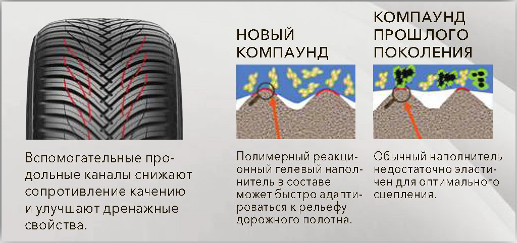 — особый гелиевый наполнитель в составе резиновой смеси сохраняет шине мягкость в морозы и обеспечивает более плотное сцепление с дорогой, а еще он помогает протектору быстро адаптироваться к изменениям рельефа дорожного полотна;