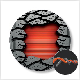 — Два нейлоновых слоя высокой плотности повышают качество рулевого управления и устойчивость шины к проколам, создавая ощущение уверенности как на дороге, так и на бездорожье.