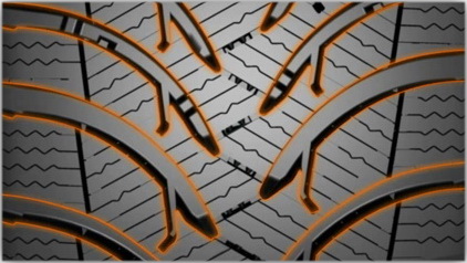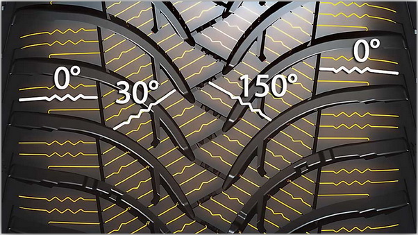 Угол расположения ламелей варьируется (от 0° до 30° или 150°), обеспечивая прогрессивное сцепление в любых ситуациях: как при движении по прямой, так и в поворотах. В результате улучшаются маневренность и управляемость автомобиля.Самоочищающийся рисунок протектора