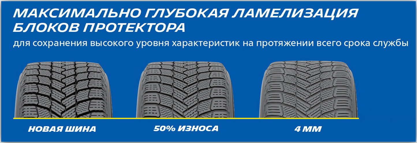 [5] Средний показатель в сравнении с шиной MICHELIN X-Ice 3 по результатам торможения на снежном покрытии (со скорости 35 до 5 км/ч) в новом состоянии и изношенном состоянии до 4 мм.