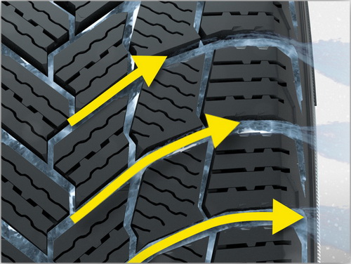 Симметричный направленный V-образный рисунок протектора с увеличенной шириной водоотводных каналов и запатентованной формой блоков служит для эффективной эвакуации снега и воды из пятна контакта.