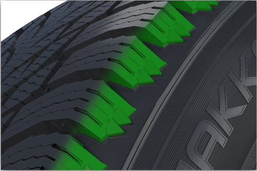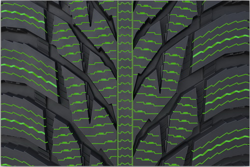 Сбалансированное управление обеспечивается благодаря внедрению большой группы инноваций, а также развитию уже проверенных решений. Центральная зона NOKIAN Hakkapeliitta R3 SUV имеет уже знакомые многим, эффективные и запатентованные ламели-насосы, вот только их количество увеличилось по сравнению с предыдущей моделью. Ламели удаляют воду из пятна контакта, обеспечивая стабильное и надежное сцепление на мокрой дороге. К краям шины также была добавлена обширная и плотная сеть ламелей. Острые зигзагообразные края открываются и закрываются при торможении и ускорении, тем самым улучшая сцепление с мокрой дорогой.