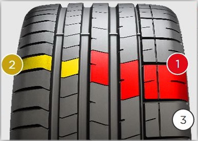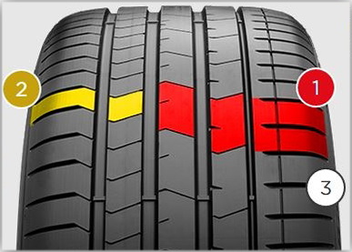 [2] Внутренняя (inside) плечевая зона — высочайший уровень безопасности на мокром покрытии благодаря высокому содержанию диоксида кремния, улучшенная тяга и комфорт при вождении за счет увеличенного шага блоков протектора