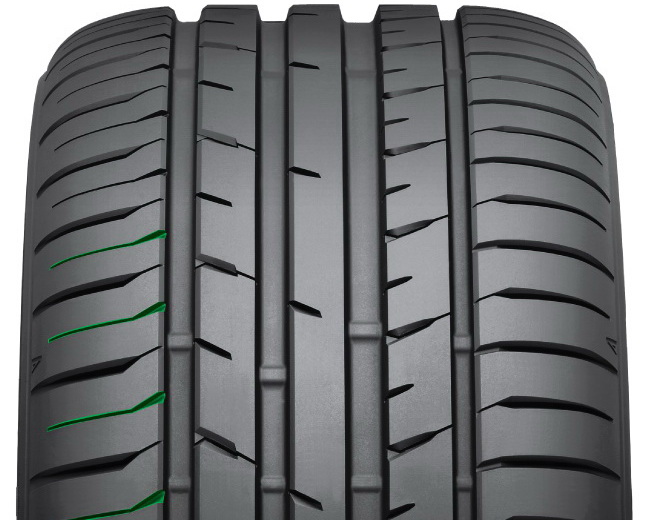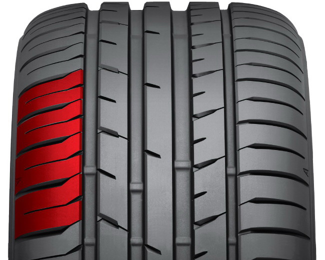 В рисунке протектора TOYO Proxes Sport есть следующие особенности. Кромки блоков протектора скруглены — так давление в пятне контакта распределяется равномернее, следовательно, улучшается сцепление и замедляется износ. Также инженеры Страны восходящего солнца применили водоотводящие канавки нового типа. Они расширяются в форме клина ближе к поверхности шины, что улучшает сцепление, курсовую устойчивость и распределение давления в пятне контакта.