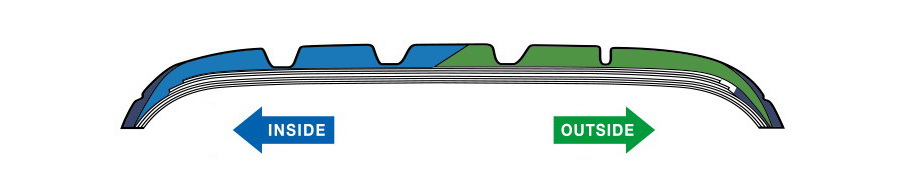 Две широкие канавки на внутренней стороне шины обеспечивают хороший отвод воды из пятна контакта, в то время как реберный дизайн протектора с повышенной жесткостью обеспечивает улучшенные тормозные характеристики при движении вперед и реверсе. Твердая форма внутренних ребер отвечает за повышенную прочность, более эффективное торможение и снижение неравномерного износа.Отличная устойчивость на прямой
