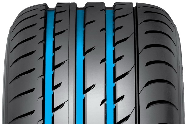 ВНИМАНИЕ! В зависимости от ширины протекторной части у шины TOYO Proxes T1 Sport существует два типа рисунка — шины с протекторной частью 285 мм и шире имеют дополнительное центральное ребро для улучшенного сцепления и достижения оптимальных характеристик при прохождении поворотов.Рисунок протектора шины TOYO Proxes T1 Sport содержит пять или шесть продольных ребер, за счет чего обеспечиваются высокие показатели курсовой устойчивости. Широкие плечевые зоны протектора повышают стойкость шины к деформациям, возникающим при прохождении поворота, что существенно повышает стабильность поведения шины в поворотах, а также предотвращают появление неравномерного износа. Три широкие продольные канавки смещены к внешней стороне протектора, более загруженной при прохождении поворотов, что существенно повышает эффективность отвода воды из пятна контакта в поворотах.