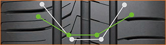 Асимметричный рисунок протектора и жесткое центральное ребро повышают курсовую устойчивость на прямой. Массивные блоки в наружной плечевой зоне улучшают сцепление в поворотах.