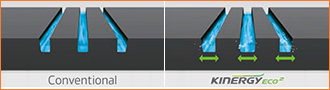 Одной из важнейших задач при разработке новых шин линейки KINERGY стало повышение эффективности торможения на мокром дорожном покрытии. Так, протекторная смесь с повышенным содержанием силики, улучающая сцепление шины с дорожным полотном, в сочетании с технологией смешивания, уже применяемой при производстве высокотехнологичных продуктов концерна, обеспечивает существенно улучшенное распределение полимеров и наполнителей в смеси. За счет этого удалось добиться как более эффективного торможения на мокром дорожном покрытии, так и сниженного сопротивления качению. Кроме того, три продольные канавки обеспечивают быстрый отвод воды из пятна контакта, повышая тем самым управляемость автомобиля на влажной дороге.