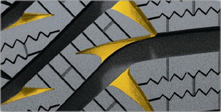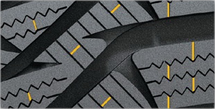 Конструкция широких канавок обеспечивает эффективный отвод воды и слякоти от центра в стороны, предотвращая тем самым риск возникновения эффекта аквапланирования.Когтеобразные засечки