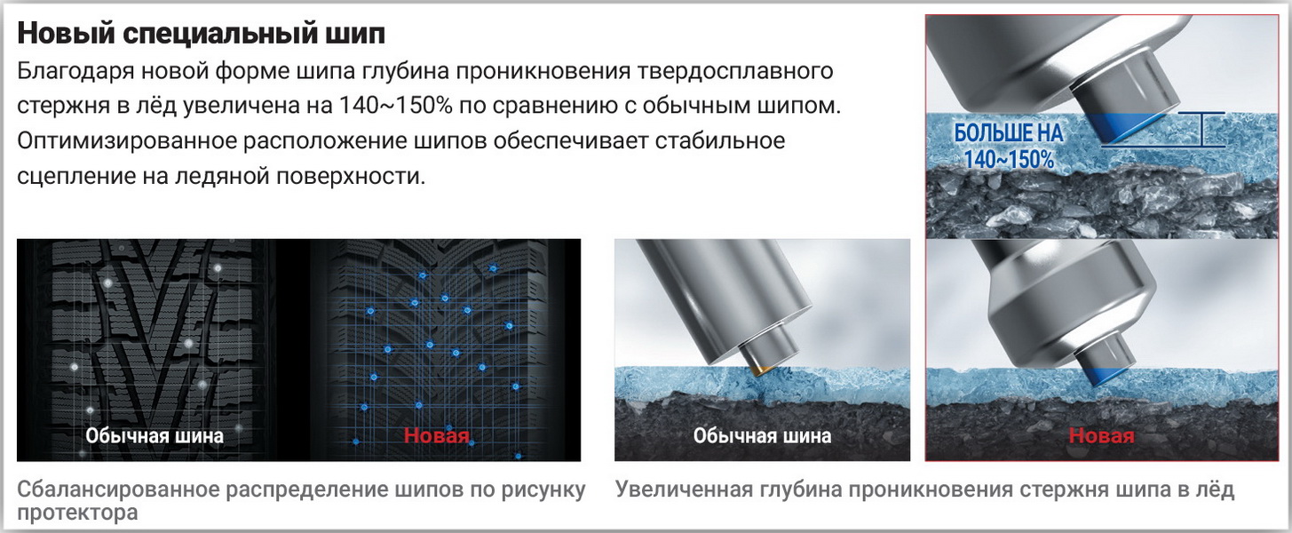 Как всегда в этом сегменте, особое внимание было уделено конструкции шипов, которые обладают запатентованной формой, позволившей, по заявлению производителя, на 140-150% увеличить глубину проникновения твердосплавного наконечника в поверхность льда. Схема расположения шипов, которых в шинах размера 205/55 R16 устанавливается по 190 штук на покрышку, была доработана для стабилизации продольного и поперечного сцепления на обледенелой поверхности.