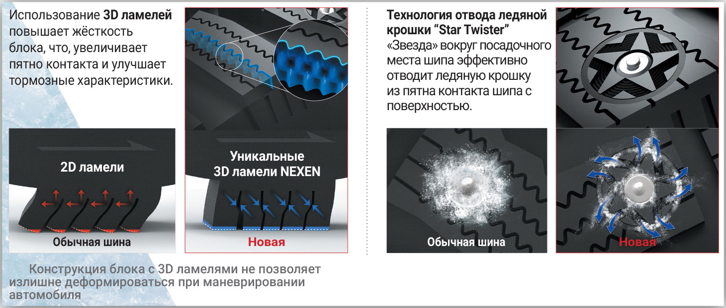 В протекторных блоках расположены инновационные 3D-ламели, которые повышают жесткость протектора под нагрузками, улучшая управляемость и эффективность торможения на сухой дороге. Изменился также дизайн посадочного места шипа, который был выполнен в виде звезды - Star Twister. Инженеры Nexen заявляют, что благодаря такому решению ледяная крошка быстро отводится из пятна контакта шипа с дорогой, и шина работает с предельной эффективностью.