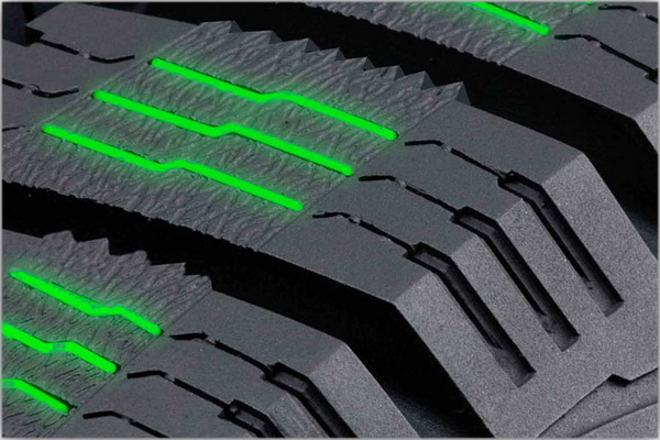 Ламели-насосы, встроенные в шашки плечевой зоны, выкачивают воду из пятна контакта по принципу насоса и обеспечивают надежное сцепление с дорогой, а также уменьшают риск аквапланирования.