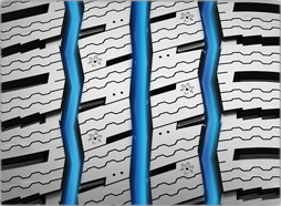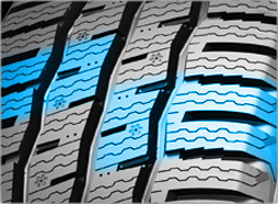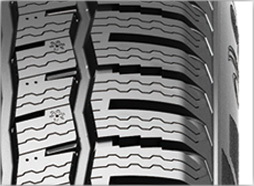 Продольные и поперечные канавки служат для очистки шины от снега, эффективно отводят воду из пятна контакта. Z-образные кромки блоков протектора в плечевой зоне улучшают тягово-сцепные возможности на снегу и льду.