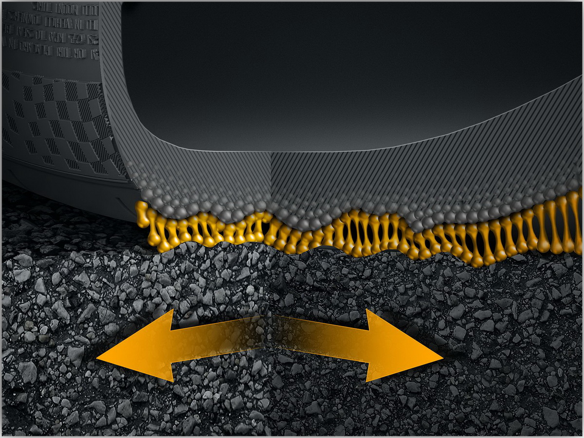 Аквапланирования же удаётся избежать при помощи геометрии рисунка протектора: поперечные канавки не смыкаются под нагрузкой, расширяемое пятно контакта во внешней плечевой зоне работает для повышения стабильности движения, при смыкании специальных элементов протектора обеспечивается дополнительная площадь контакта.